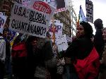 Photos of the pink and silver sections of the peace demonstration: Code Pink, the samba band and associated dancers.