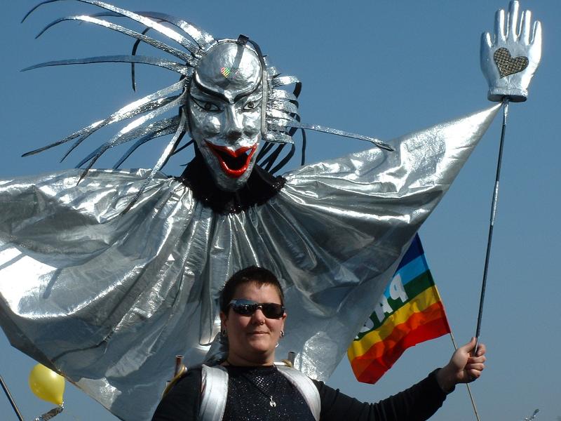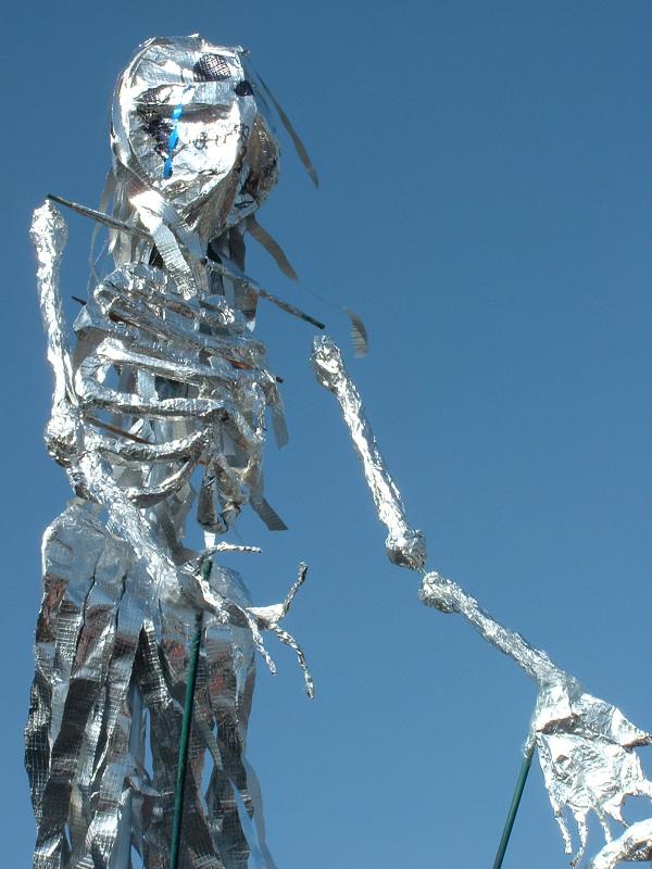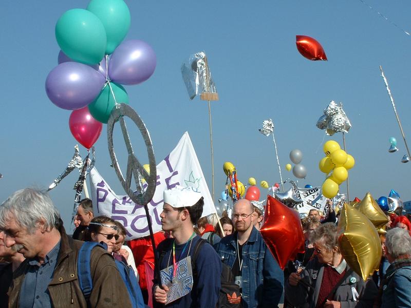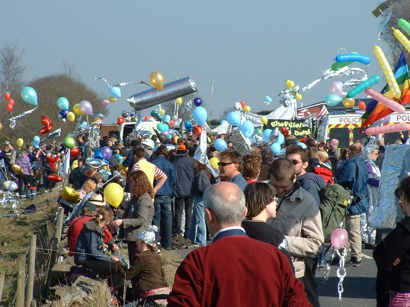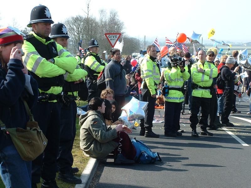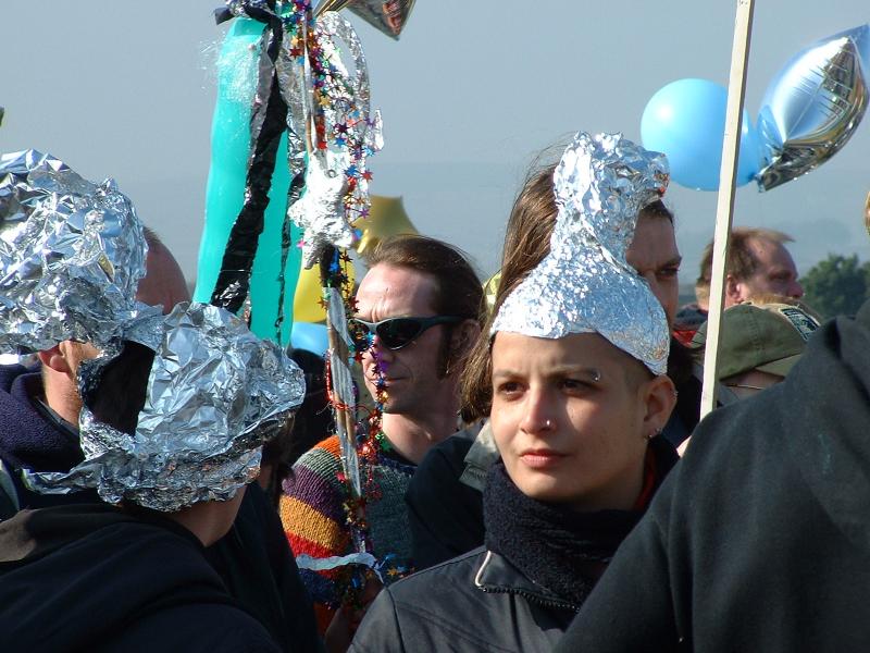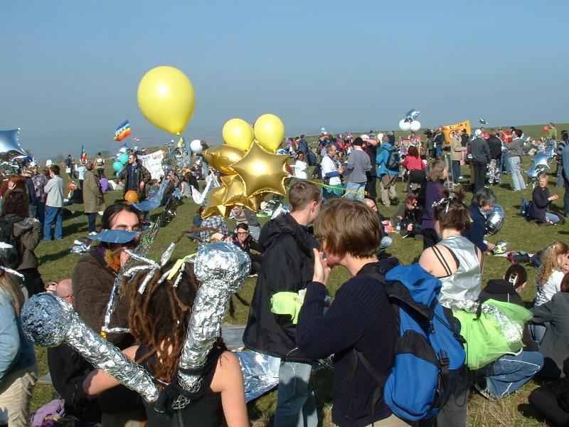 Thousands joined the Foil the Base demonstration at the US spy base at Menwith Hill on 22nd March 2003. There was a carnival atmosphere with many people dressed in tin foil, music was provided by the Sheffield Samba Band and the Trollyd Soundsystem amoung others. There were a couple of attempts to break into the base, one using rope to pull down the fence and one to dig under it. There was a heavy police presence and several scuffles and some arrests. [Photos]
