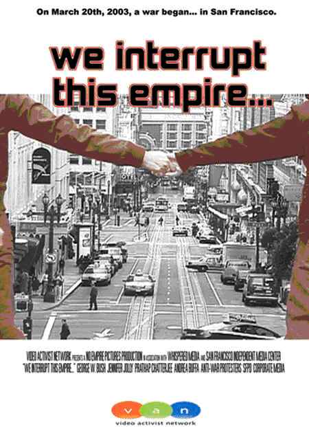 "We Interrupt This Empire..." is a collaborative work by many of the Bay Area's independent video activists which documents the direct actions that shut down the financial district of San Francisco in the weeks following the United States' invasion of Iraq. With the audio backdrop including the live broadcasts of SF Indymedia's Enemy Combatant Radio and the SF Police Department's tactical communications that were picked up by police scanners, the documentary takes a look at the diverse show of resistance from the streets of San Francisco as well as providing a critique of the coporate media coverage of the war and exploring such issues as the Military Industrial Complex, attacks on civil liberties, and the United States' current imperialist drive.
