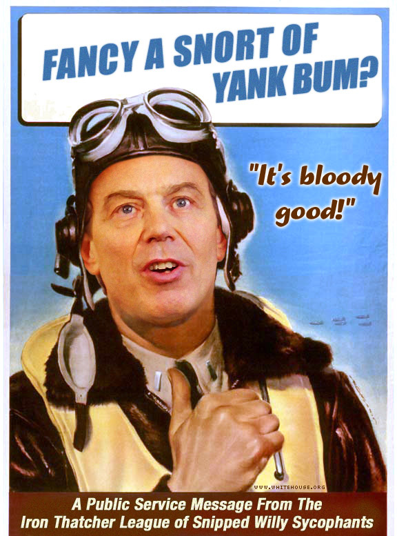 As usual Ms. Bush will wear Tony's favourite spikey strapon and fuck the pig arse when he sucks Dubya's tiny willy.
