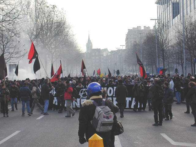 - 2.00pm: Anarchist demo, 2,000 strong, is now under way, moving towards central Brussels. Police present in the streets around the march. Reports of undercover police trying to infiltrate the demo. So far no reports of confrontration or police violence.