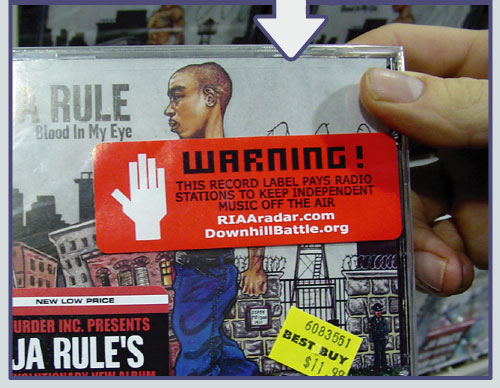 The Music Activism group has created 1" x 3" CD labels, designed to be stuck on manufactured, mass-marketed CDs during the Christmas shopping rush. One says "WARNING: Buying this CD Funds Lawsuits Against Families and Children." The other: "WARNING: This Record Label Pays Radio Stations to Keep Independent Music Off the Air."