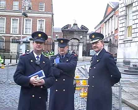 While filming on the footpath 1 of 3 Garda inspectors approached the journalist put his hand over the lens turned off his camera and manhandled him down Dame St. He joined an RTE crew, where he was approached by another Garda who informed me he was "not allowed to film here."