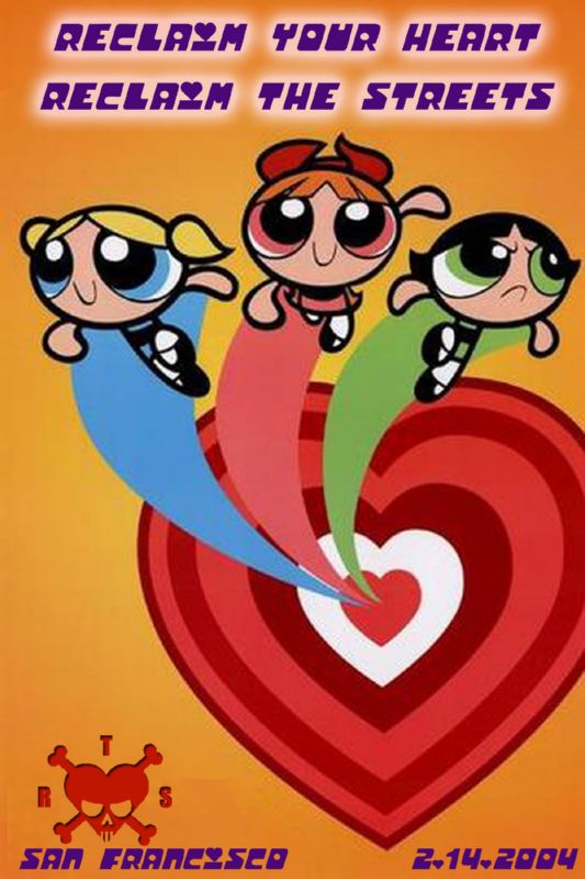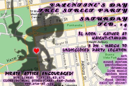 The pirate vessels of Reclaim The Streets docked on Haight street between Ashbury and Stanyan this afternoon at approximately 1:20PM. Numbered between 200 and 300, the marchers, many dressed in Valentine's Day pinks and reds as well as frilly-shirted pirate outfits decamped mid-way between Ashbury and Masonic streets, setting up two separate pirate ship dance areas. One area featured a booming techno sound system which attracted a throng of marchers and spontaneous particpants. The other mini-camp featured a pirate marching band and live dance performances and street theater. Police on foot, motorcycle and cruisers flanked the event on both side. Police had also gathered in numbers at Masonic and Waller. Police presence also included at least one paddy wagon and a helicopter in addtiton to some 10 cruisers cars.