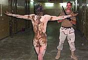 A naked prisoner who appears to be covered in excrement is paraded down a corridor