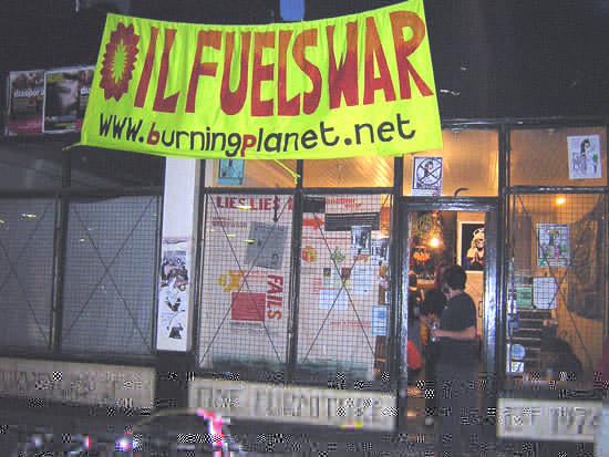 At least three potential private view schmoozers were so impressed by the anti-BP arguments that they refused to cross the climate chaos picket line and spent the evening instead at the newly squatted and fitted with oily-and-other-art gallery at 50 Chalk Farm Road, NW1. Others visited afterwards. This space was filled with art-with-attitude, activist types as well as passing punters answering the call of 'come get your free culture' from a 5 year old lad sitting on the shoulders of a 6 foot friend. Others were intrigued by the bright yellow 'oil fuels war' banner set up outside, (opposite a Safeway petrol station as it is, with Texaco up the road (where sympathetic Sri Lankans work) and Esso just a few yards in the opposite direction.