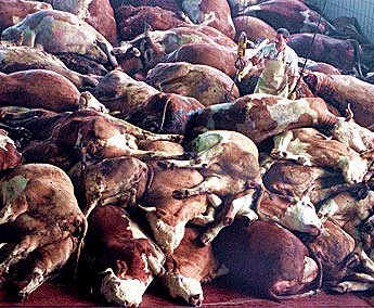 -Crammed together, animals must stand in their own excrement while exposed to extreme weather in open trucks, sometimes freezing to the trailer. These conditions can result in “downers”—animals too sick or weak to walk, even when shocked with electric prods or beaten. Downers are dragged by chains to slaughter or to “dead piles” where they are left to die-