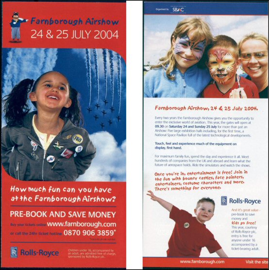 Clearly the aerospace industry know they have a problem in public perceptions and they need to counter this. That military aircraft are weapons with an obvious function is difficult for the industry. Farnborough is important in fostering acceptance of the arms industry - when you can stand close to fighter aircraft resting silently on the tarmac, then they seem almost harmless. That the Hawk jets are colourfully painted and perform aerobatics once again helps to foster acceptance of the weapons. "See the rivalry between the fastest machines in the air and on the ground as a military jet and Formula 1 car face along the runway" says this year's programme about a planned motor sports feature. The message is clear - weapons systems are little different to sports, they are harmless fun. The cover of this years public leaflet shows a girl with pigtails grinning as the Red Arrows pass overhead, with the slogan "How much fun can you have at the Farnborough Airshow?" To help the kids enjoy the family day out there's a Ronald McDonald-esque Captain Farnborough, as well as face painting.
