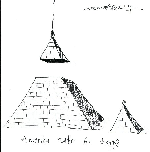 The whole world may well breathe a sigh of relief; the Bush regime is both dangerous and universally loathed; but that is not the point. We have debated lesser evilism so often on both sides of the Atlantic that it is surely time to stop gesturing at the obvious and to examine critically a system that produces the Bushes and their Democratic shadows. For those of us who marvel at our luck in reaching mature years without having been blown to bits by the warlords of Americanism, Republican and Democrat, conservative and liberal, and for the millions all over the world, who now reject the American contagion in political life, the true issue is clear. It is the continuation of a project that began more than 500 years ago..."