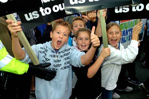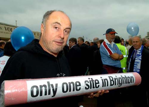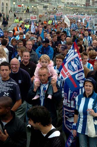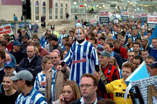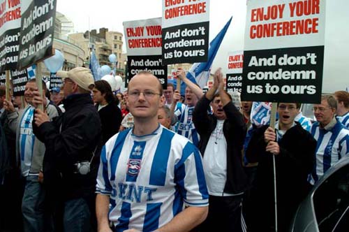 The club wants to relocate to a site near the university but awaits the decision of John Prescott. Today's noisy demo saw more fans of the club turn out (on a weekday) than the present stadium actually holds. If the club don't relocate to somewhere bigger their chances of promotion are pretty much fucked. They sell out their present ground every week but due to it's size they still make a loss.
