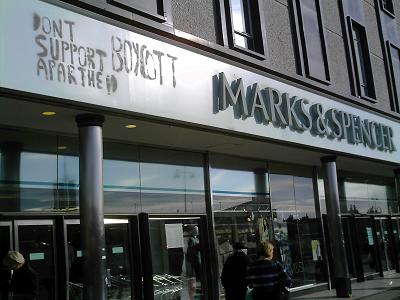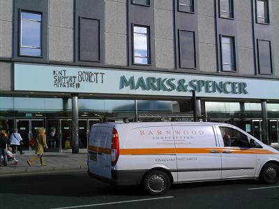 This was done in response to Marks and Spencers racism and support of Zionism (see below) and in solidarity with the suffering people of Gaza.