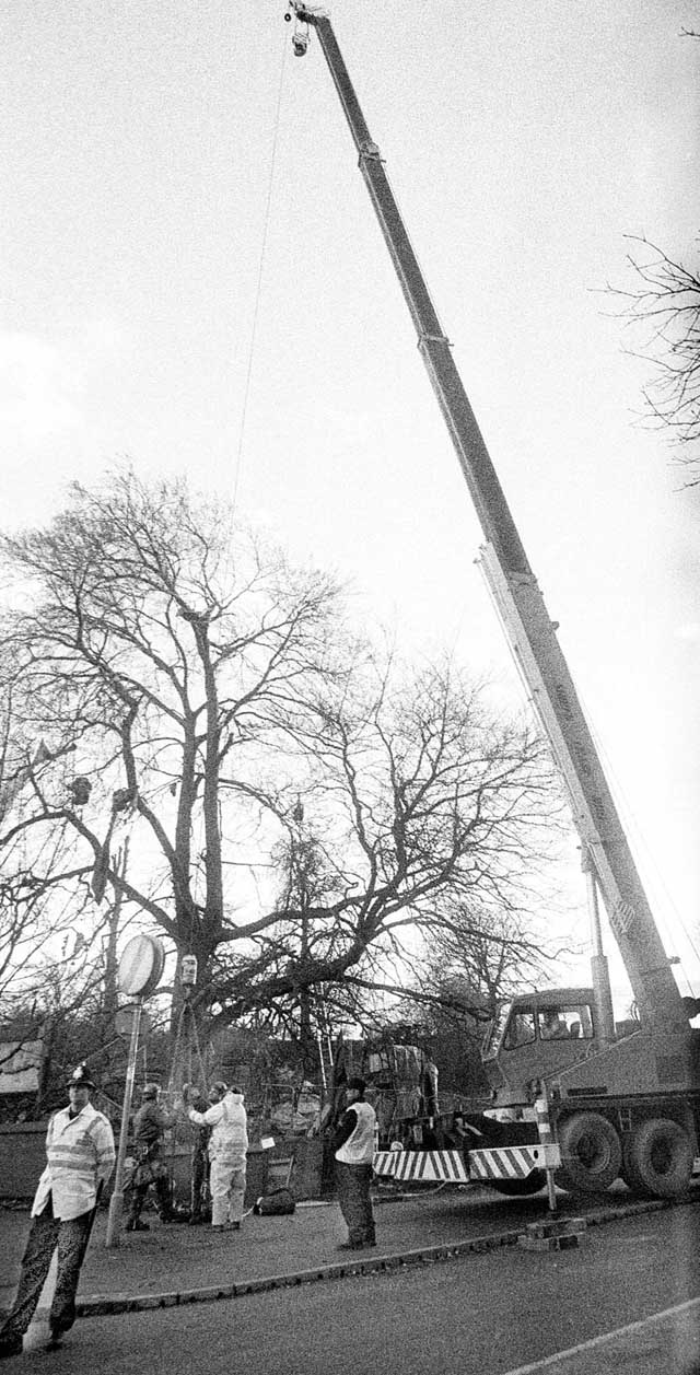 While taking these, the police confined us to an area, without much of an overview of the site at ground level. I tried to see some of the activity there, but police were quite physical in shoving me back. They even kept me from the pavement from the other side of the road. I took it up with the police liason officer, who said I couldn't be there because of 'Health & safety considerations'. There was no felling work for a long long way in any direction.