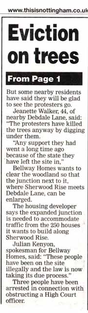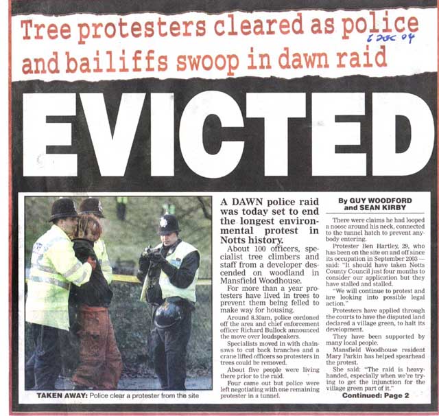 After over 14 months spent protecting a village green from illegal destruction protesters in Sherwood forest were evicted on 6th December 2004 after the Police turned up without warning at 8am.