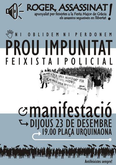 Roger A.G., the young squatter stabbed on the 15 of August in the Gràcia district of Barcelona by a group of nazi skinheads, has died in the Hospital de la Vall d'Hebron after almost five months in a coma. At two in the morning on Sunday 15 August, during the Gracia neighbourhood fiesta, the police found Roger lying in a pool of blood, and arrested six skinheads at the scene. In September, Court number 11 of Barcelona which was investigating the brutal attack, freed the main suspect on 3.000 euros bail, despite orginally arguing that there was a strong risk of him reoffending because of "the strong hostility between these street gangs" referring to nazi skins and squatters. The judge ordered the other five people arrested at the time of the attack (four men and a woman, all aged between 19 and 26) to be freed without charge...