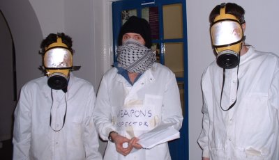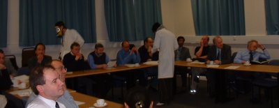http://www.baesystems.com/virtualuniversity/). Protesters decided to stage a short disruption shortly after the lecture began, based around dropping leaflets and registering disagreement. Donning laboratory coats and gas masks to mimic weapons inspectors, four protesters entered the seminar room and distributed information leaflets (as no students were in attendance, the ethical careers leaflets were not required). Neither the delegates nor the speaker showed much surprise and no attempt at hindrance was made.