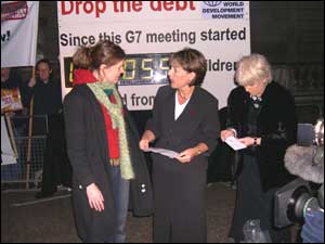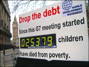 As the G7 finance ministers meet at Lancaster House the World Development Movement (WDM) have constructed a giant 'Drop the Debt' digital counter outside the summit. The digital counter is recording the number of children around the world who die needlessly as a result of poverty while the G7 are meeting - one every three seconds. From the time the ministers arrived for dinner (18.45 on Friday) until they depart (17.00 on Saturday) 26,700 children will have died.