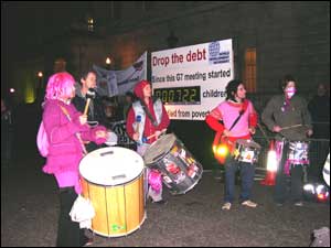 Despite the short notice (and thanks in no small part to the drummers) the finance ministers and bankers didnt get to enjoy their dinner in peace. Hopefully, the trembling rythms of a samba band did nothing for the rich mens digestion! Yet this was only the first of the G7 Minesterials which mark the countdown to the G8 Summit in July, and as the Summit gets closer our resistance to these meetings must get stronger - lets shut them down!