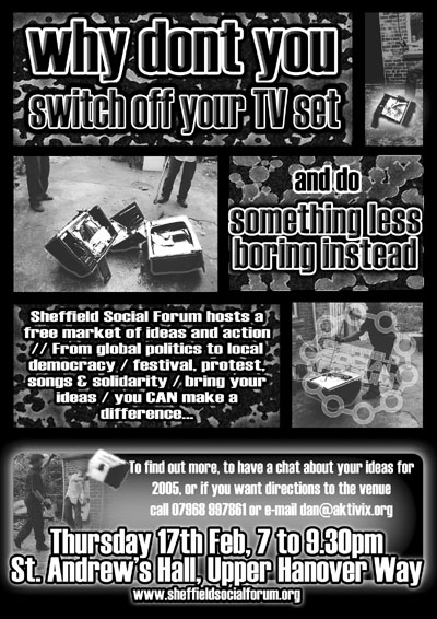 Sheffield Social Forum's first foray into 2005 is to be a 'Big Open Meeting' where all these ideas and others will be up for grabs.