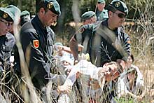 About 12’30 a.m. the march, that at this time had a lenght of about 100m, crossed the road and started walking directly beside the headquarter's fence. Some minutes later they reached the place where the entrance was to happen, near to the fences of the main installations of the base. Inspite of the presence of the riot police inside and outside the base and of the helicopter just a few meters above the inspectors' heads, the fourteen inspectors in charge of carrying out the inspection of the interior of the base, managed to cross the wire fences and entered the military site. During these moments it could be seen that the officers were acting with more brutality that in former editions of this action, threatening the participants with their truncheons, pushing them violently and even grabbing their necks. The persons that had entered the base did not manage to advance in direction of the main installations on accounts of the expeditiuos conduct of the riot police, that after surrounding and concentrating the group on a small spot forced them to sit down using in several cases painful immovilizing techniques. The officers that were present in the interior of the military site refused to answer any of the questions of the questionnaires that the inspectors carried with them and that treated topics such as the presence of weapons of mass destruction, uranium ammunition and cluster bombs at the NATO base. In a few minutes, and even without sufficient time to take their arab tea, the fourteen inspectors were identified and expelled, carrying them one by one over a hole in the fence to the outside. None of them was arrested.