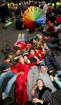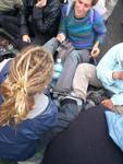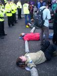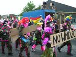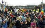 The man on the fence has stayed there from the morning till the end of the demo, at the end he was arrested, and that was the only arrest. The Samba band and the clowns were around most of the time, added considerable musical force to the demo, and the atmosphere was peacefull.