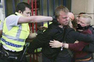 Stirling has now almost entirely calmed down - the police presence has become relatively minimal (though doubtless there are some units 'lying in wait') with only about ten officers guarding the train station and checking IDs/destinations etc. There was an attempt to block traffic from living the Horizone by a police line (at about 10.30 am) but by 11.20 or so the traffic was flowing freely again...