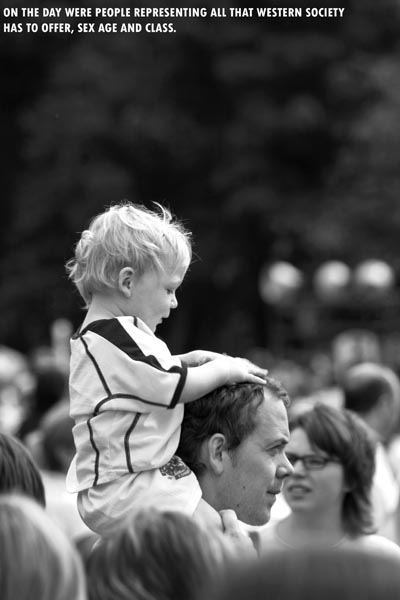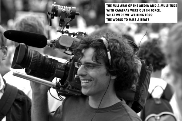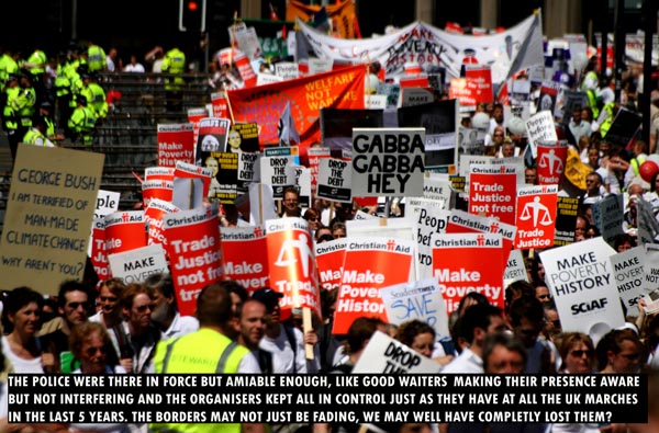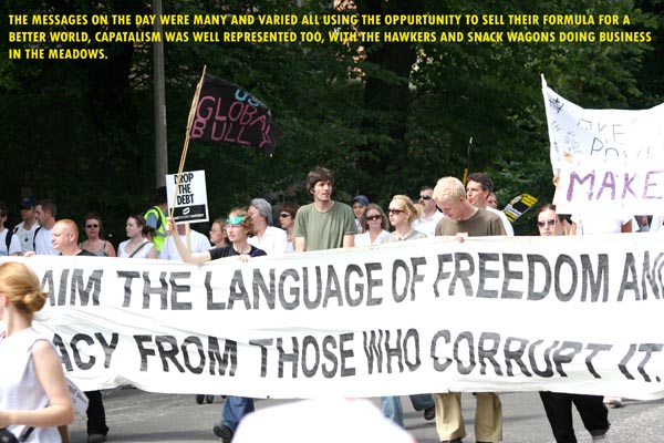 At the end of the march we returned to the meadows where we listened to the speeches and clapped and cheered as we were told how much we were doing. Back at the beginning of the march people were still queuing to begin like it was some fairground ride. There came a moment on the stage were the guy talking told us we should all stand for a minutes silence with the clock counting it down on the big screen. When it had finished he proceeded to tell now it was not our fault if nothing was done to stop the poverty in Africa (the continent) but rather the fault of those attending the G8. Basically he told us to continue to disillusion ourselves, at that point there were dead union workers turning in their graves.