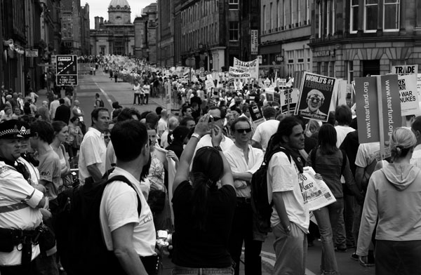 The day was beautiful encouraging many to attend and the restaurants were going to make a killing. Things all began in the Meadows where there were people representing all walks of life, from the very young to the very old. Also in the meadows there were stalls, tents and people offering material representing the whole spectrum of fringe politics, from the Lib. Dems. To Anarchists. At one end of the field was a stage which had representatives from the screen and music industry dragged across it screaming platitudes for reasons I’m not even sure they were completely aware of. Along side them we were presented with representatives from every sphere of politics and the news, we were witness to what can only be called a spectacle. All around was all the media we could muster hoping that something will happen during the day to disrupt the event and to be witness to it with their cameras glued to their eye. Trust me I know how these people think, part of me thinks the same way. Who wants to represent when you can get drama. Sadly they’re 10 years out of luck for that.
