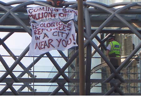 The sign is not clear in the images, it says: COMING SOON: MILLIONS OF ECOLOGICAL REFUGEES, IN A CITY NEAR YOU!