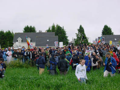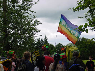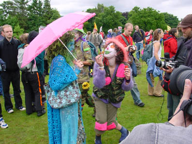 We then came back up for the Gleneagles march on Wed. We drove through the night to get there by morning. As we reached the fourth Bridge we were asked to pull over so our car could be checked undersection 60. They took our drivers details, looked through the boot, check out the inside of the car, asked our plans for the day and then let us go. We passed several double decker busses of riot police on the way, police were all along the roads to Auchterarder. We found several entrances to the village but police had blocked them all off. This was about 6.30 in the morning. We'd listened to the radio all the way to check on traffic. Luckily we reached the village before all the main road blocks started. Our friends were staying in the eco-village in Stirling, they called to say they'd been blocked in and were surrounded by police after the mornings trouble.