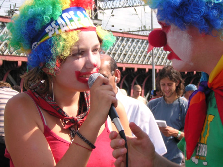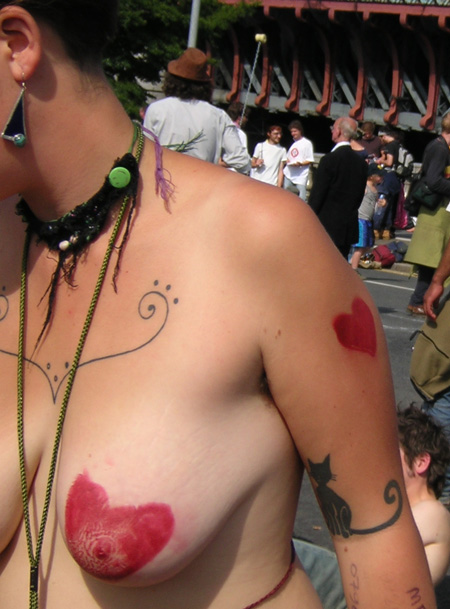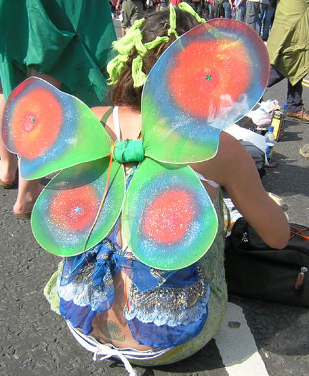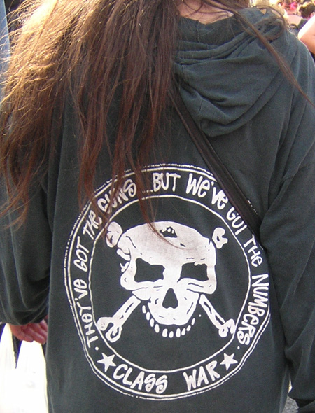 My friends and I arrived late to the Boogie on the Bridge street party. We had left late in a car from Edinburgh to Glasgow, and we weren't sure exactly where to go to find the party. I guess that people had marched to this bridge (?) and set up their party. People were eating, drinking, drumming, dancing, chatting, selling anarchist magazines and fun patches... People had anti-G8 signs, since Friday was the last day of the G8 meeting in Scotland, and there were anti-climate change messages chalked on the sidewalks, drawn on people's bodies, and on signs. It was the quietest illegal street party I have ever been to- there was no large sound system. Some people did have radios and other smaller sound systems.