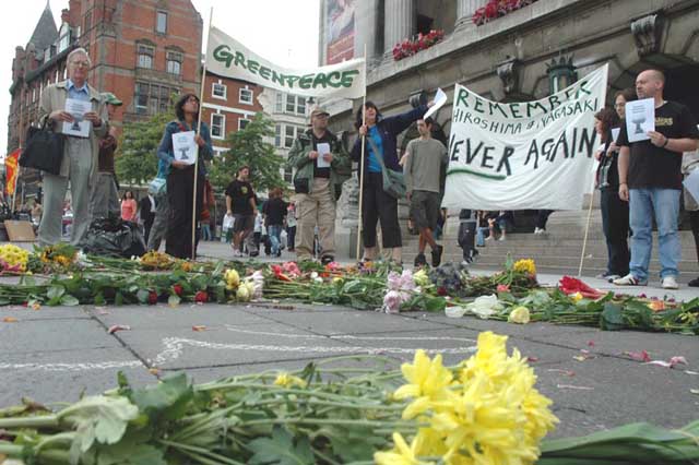 60th Anniversary vigil in Market Square, Nottingham organised by Nottingham CND and Greenpeace. Local groups holding events all across the country to commemorate the 60th anniversary of the atomic bombing of Hiroshima and Nagasaki.
