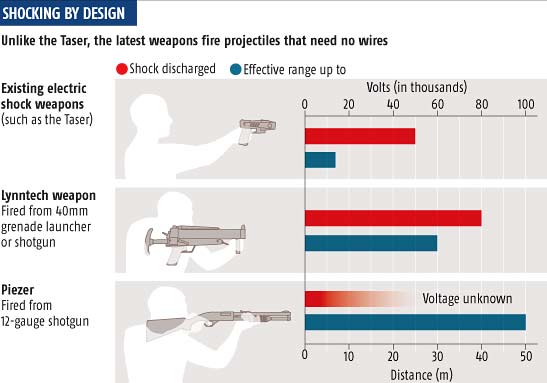 Lynntech of College Station, Texas, is developing a projectile that can be fired from a shotgun or 40-millimetre grenade launcher. Grenade launchers are already used by riot police to fire tear gas and baton rounds. On impact, the device sticks to the target and delivers an 80,000-volt shock for 7 seconds, using a pulsed delivery similar to that used by Tasers. Further shocks can be triggered via remote control.
