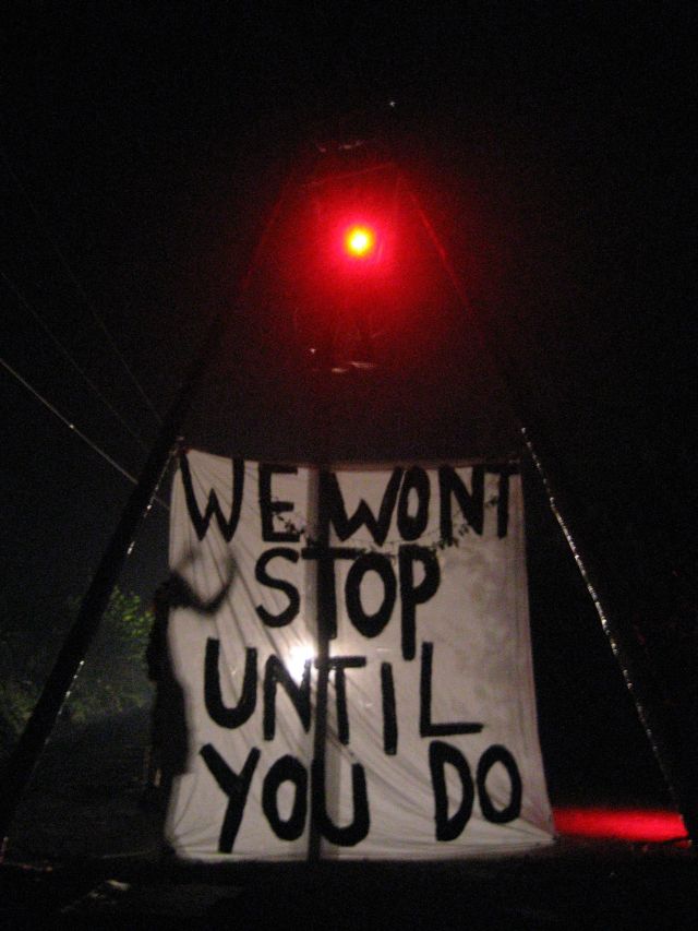 Mr. Nance then got out of his truck and began to approach the tripod, which was supporting a protester elevated 30 feet in the air. “I told Mr. Nance repeatedly and calmly that he would be putting this person's life in danger if he upset the tripod,” said Daniel Lee, who filed his Assault and Battery complaint after receiving a kick in the stomach from Mr. Nance. “I take responsibility for my act of civil disobedience in defense of these mountains,” Mr. Lee said. “They might want to think about taking responsibility for their actions.” The tripod was toppled to the ground by a combination of police and NC security, resulting in a knee injury for the person suspended inside it.