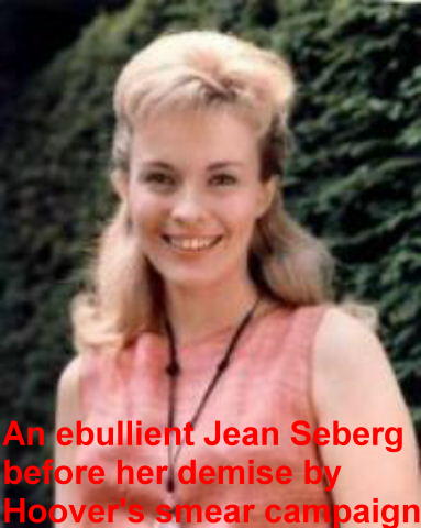 Jean, like her contemporaries Jane Fonda and Vanessa Redgrave, was politically active in the late 60’s and was particularly supportive of the NAACP (National Association for the Advancement of Coloured People). She spoke out after the assassination of Dr Martin Luther King in 1968 and was friendly with the Black Panthers to whom she is reputed to have donated $100,000 [around $1 million in today’s money]. While Jane Fonda was dubbed `Hanoi Jane` and Redgrave’s career suffered because of her support for the Palestinians it was Seberg who was to pay the heaviest price when she fell foul of FBI director J. Edgar Hoover. Hoover, `the boss` from 1924 till his death in 1972, saw Jean as a particular threat because of her popularity on both sides of the Atlantic. These were the days of an FBI campaign, sometimes forgotten today, called COINTELPRO meaning Counter Intelligence Programme. Briefly COINTELPRO was a series of programmes of political harassment directed against black and socialist organisations such as the Black Panthers, the Civil Rights movement, the Socialist Workers Party and the burgeoning 1960’s peace movement. Not lawful investigation, but actual criminal acts committed by the FBI designed to deny the black population (along with Native Americans, the anti-war movement, and the early feminist movement) their civil rights. It involved widespread and illegal wiretapping, the use of smear campaigns, infiltration and outright violence against those groups deemed to be a `threat` to the American Apple Pie way of life. The White Anglo Saxon Protestant US ruling class including Hoover had a particular dislike for the Black struggle especially militant or uncompromising organisations like the Panthers. According to a former Los Angeles based FBI agent (M. Wesley Swearingen) a culture of racism had permeated the bureau and their venom was particularly directed towards the Panthers and the white women who associated with them. Hoover was reputed to have said he was going to 'take care of those two bitches' - meaning Jean and Jane Fonda. But Hoover said it was Seberg who kept him awake at nights. When a high profile blonde actress like Jean devoted much of her money and time to them Hoover singled her out for exceptionally harsh treatment. On April 27th 1970, just seven weeks after the New York release of Airport, SAC [Special Agent in Charge] in Los Angeles Richard Held sent a memorandum to headquarters requesting permission to smear Jean: It reads: “Bureau permission is requested to publicize the pregnancy of JEAN SEBERG, well known movie actress, by [DELETED] Black Panther Party (BPP) [DELETED] by advising Hollywood `Gossip-Columnists` in the Los Angeles area of the situation. It is felt that the possible publication of Seberg’s plight could cause her embarrassment and serve to cheapen her image with the general public”