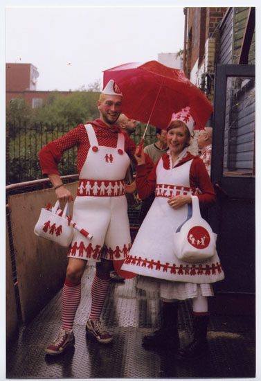 One Solidarity Sister explains: 'We have appeared in these costumes a couple of times in Nottingham and in Sheffield. We dress in little white dresses, with one of us in lederhosen and hats and bags.. It's about showing solidarity. It's more a sort of universal image. On the bands and the skirts there's lots of images of people holding hands. It's about spreading equality, friendship and acceptance. We look a little bit like aid nurses. Like it's about having a helping hand. Being there to support people. The dresses we're made from reclaimed fabrics. They we're used for car seat padding. It's good to be reusing stuff.'