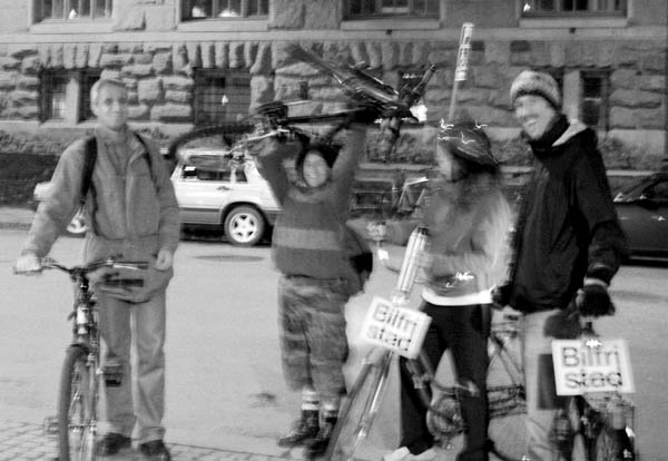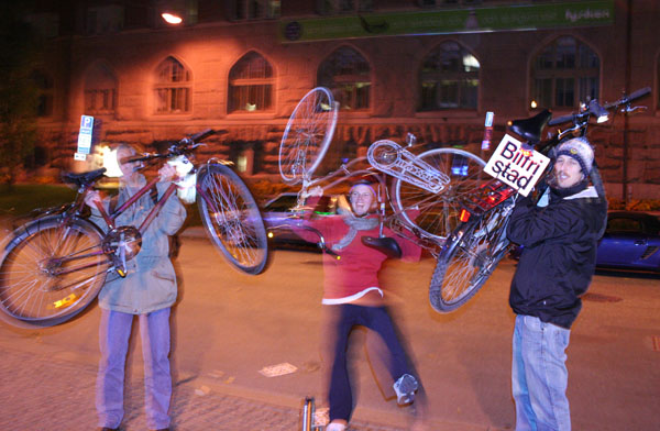 A nice touch was a Swiss tourist who just happened to be passing, joining in and getting a lift. She’d been at the Budapest cm last month and unwittingly carried the Critical Mass torch with her up to Sweden.