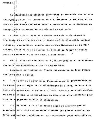 * See the copy and note that the date of a Niger "ordonnance" cited in the alleged agreement ("Annexe 1") is off by 26 years. The "74" in "le ordonnance" (sixth line down) refers to the year 1974 while the text says "5 juillet 2000." You can easily discern such discrepancies for yourself, even though these documents are in French.
