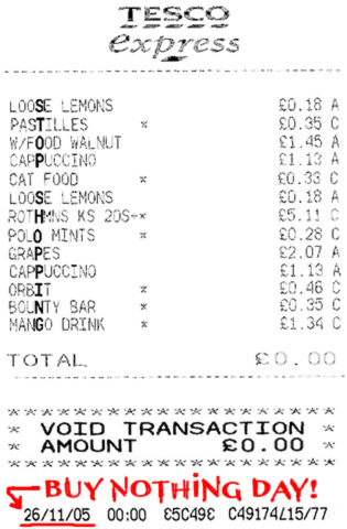 http://adbusters.org 'Saturday November 26th 2005 is Buy Nothing Day (UK), the self-proclaimed festival of frugal living and culture jammers jamboree. It's a day where you challenge yourself, your family and friends to switch off from shopping and tune into life. Celebrated as a holiday by some, a street party by others - anyone can take part provided they spend a day without spending!'