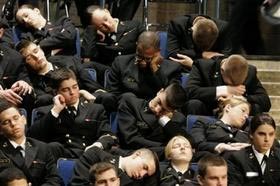 In all of America, Bush could not have chosen a less critical, more muzzled and gullible crowd to peddle his pull-out from the quagmire. No embarrassing outbursts from this plebeian crowd, only rapturous ovation on every cue. Nevertheless, Bush stumbled immediately by pointing out the military record of his Neocon crony, Rubberstamp Rumsfeld, who was sitting in the audience. This only emphasized to everyone the chickenhawk President's own sorry AWOL military desertion and and his "VEEP-for-torture's" five deferrments. The cowardly hypocrisy of it all hung in the mind's eye for the duration of the oration. One wonders what went through the minds of the midshipmen, whose "Honor Concept" code of ethics states that "Midshipmen are persons of integrity: who stand for that which is right.They tell the truth and ensure that the full truth is known. They do not lie, cheat or steal." What were they thinking, these future torturers, cluster-bombers, DU and Willy Pete dispensers, as they listened to, and dutifully applauded their Commander-in-Chief?