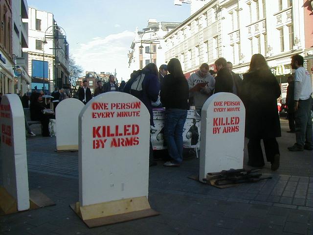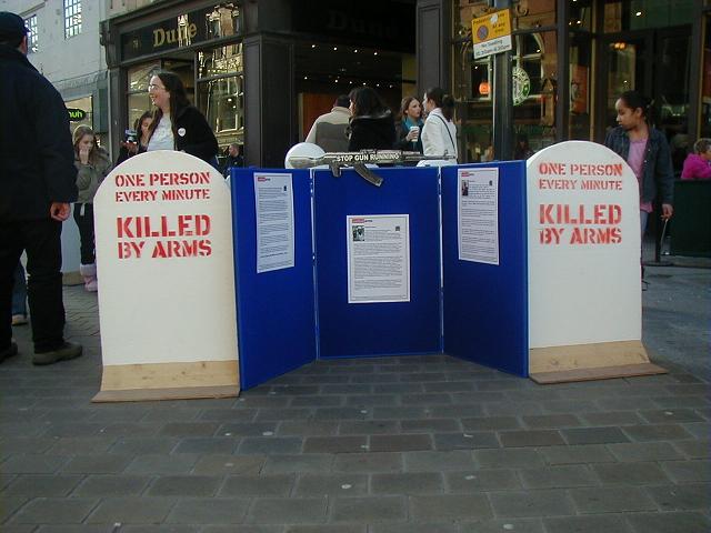 Oxfam, Amnesty International and People and Planet groups from around Yorkshire held a stall today to protest the arms fair. It's part of their aim to get a million photos of people in a visual pettition.