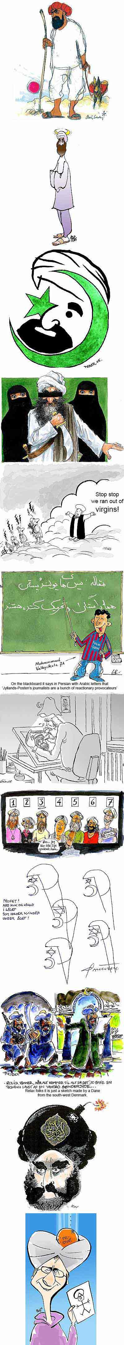 The 12 controversial drawings were originally published last September in the independent Jyllands-Posten newspaper, and afterwards in a Norwegian paper. They included one of Mohammed waving off suicide bombers on their way to heaven, saying, "Stop! We have run out of virgins!" Another one portrays Mohammed wearing a turban shaped as a bomb with a burning fuse.