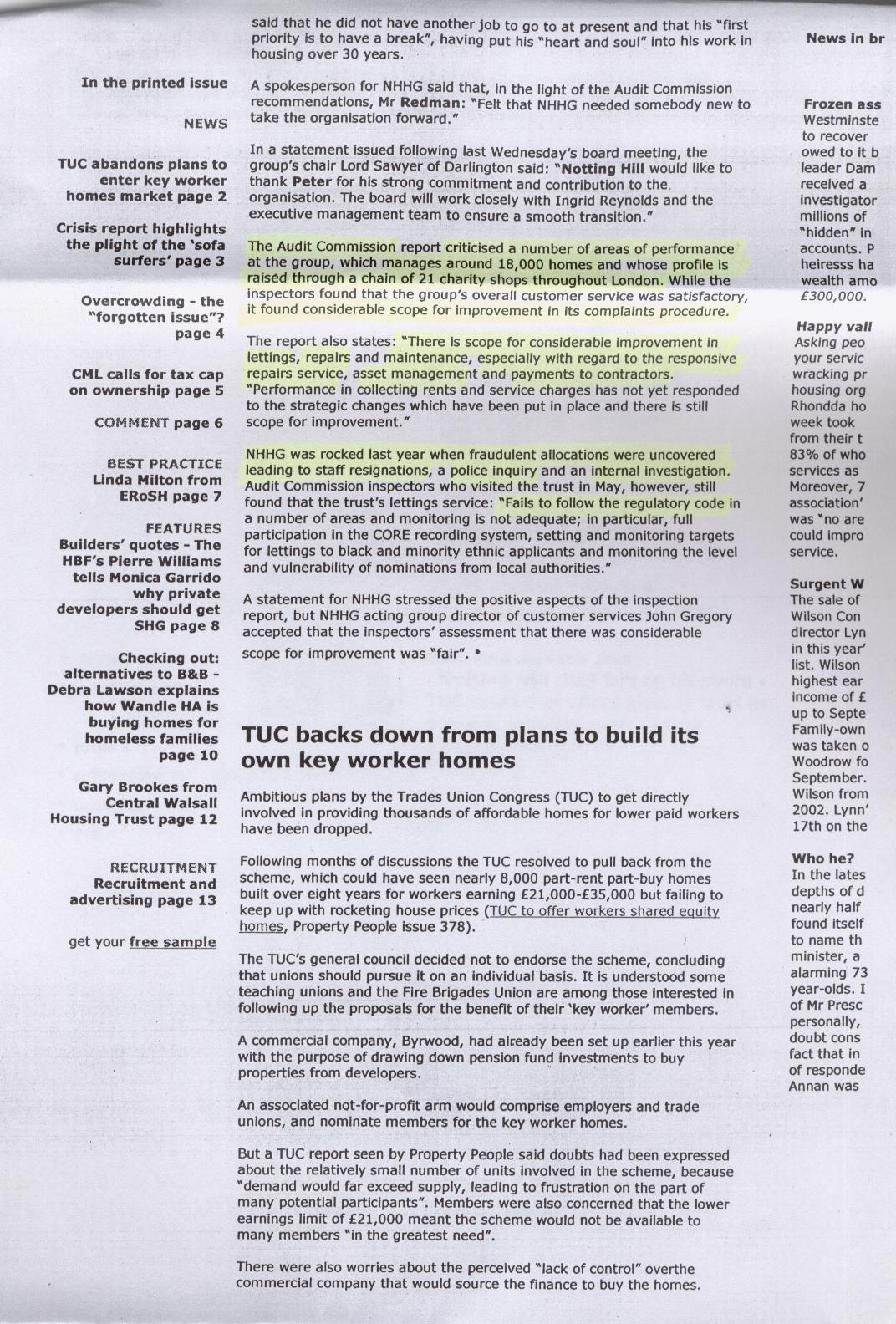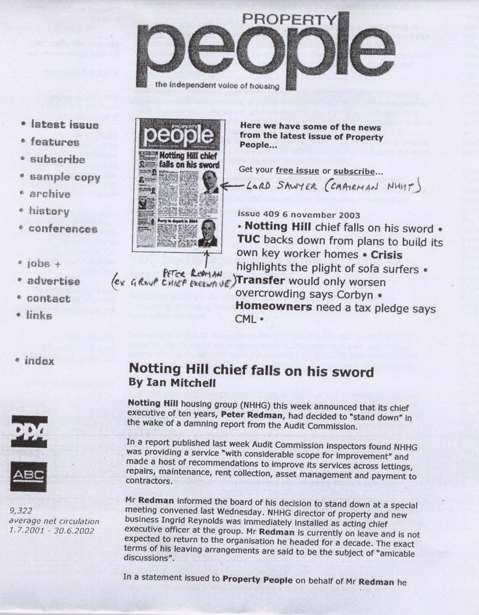 BUT what is happening at the heart of Government in the UK under the direction of TONY BLAIR is happening at the very heart of the flagship registered social landlord - NOTTING HILL HOUSING TRUST - the man appointed to head it up was LORD TOM SAWYER ex CHAIRMAN of the LABOUR PARTY after he was given a LABOUR PEERAGE by TONY BLAIR in 1998. He had previously been in charge of NATIONAL UNION of PUBLIC EMPLOYEES known as UNISON to make sure no strikes would take place from his union to detract TONY BLAIR's project.