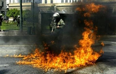 While the leftists begun to run and dispersed to recover from the tear gas, to the surprise of the police, hooded anarchists suddenly appeared out of the crowd (before that they had mingled into the crowd so as not to be spotted), quickly setting up roadblocks, in order to delay the riot cops attacking the crowd again. Indeed, stones and molotov cocktails kept them for some time at distance from the main mass of the demonstrators, while the leftists managed to regroup and recover a little further down the road.