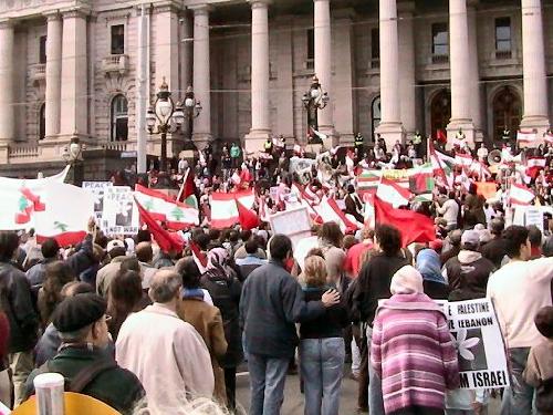 Apart from Lebanese and Palestinian speakers, the initial rally at the State Library was addressed by David Glanz of Socialist Alliance, Margarita Windisch of the Stop-the-War Coalition, and Senator Lyn Allison of the Democrats - as before, the major political parties were conspicuously absent (perhaps displaying the better part of valour, given their leaders' recent statements?). A notable feature of the halt at Parliament House was the reading of a detailed condemnation of Zionism and the acts of the State of Israel from the point of view of Torah-Judaeism, a reminder that, as the statement stressed, the State of Israel does not speak in the name of the Jewish people. And indeed, as on previous occasions, there were Jews among the protesters.