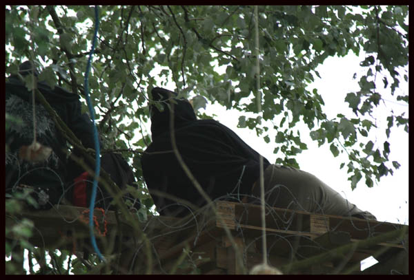 In less than a week's time the activists have built a whole tree-hut village with 13 huts and one tower. At the beginning, most huts were built during night, but since Friday people have been working day and night. It's the first time that such a big action camp has been built on elevated tree-platforms in such a short time span.