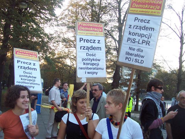 The demonstration was populated by PO (Citizens' Platform - Polish liberals), Self-defence (former co-governing rural-conservative party), Zieloni 2004 (Greens 2004), Rationale (anticatolics), Workers Democracy and Anarchistic Federation.