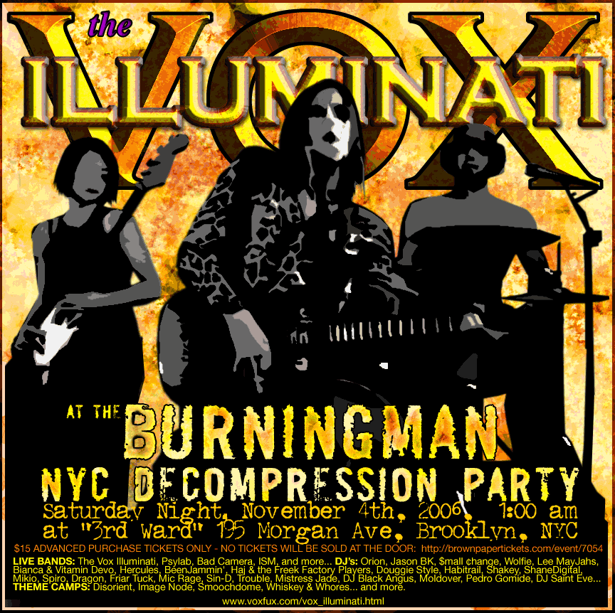 Bands Include, The Vox illuminati, Psylab, Bad Camera, ISM, and more. DJ’s: Orion, Jason BK, $mall ¢hange, Wolfie, Lee MayJahs, Bianca & Vitamin Devo, Hercules, BeenJammin', Haj & the Freek Factory Players, Douggie Style, Habitrail, Shakey, ShaneDigital, Mikio, Spiro, Dragon, Friar Tuck, Mic Rage, Sin-D, Trouble, Mistress Jade, DJ Black Angus, Moldover, Pedro Gomide, DJ Saint Eve...