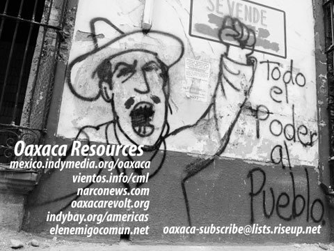 Oaxaca Indymedia, Centro de Medios Libres, Narco News, Oaxaca Revolt, Indybay’s Americas page and El Enemigo Común are the resources printed on the flyer, as well as an email address, oaxaca-subsrcibe (at) lists.riseup.net, which can be used to join the Oaxaca solidarity alert list.