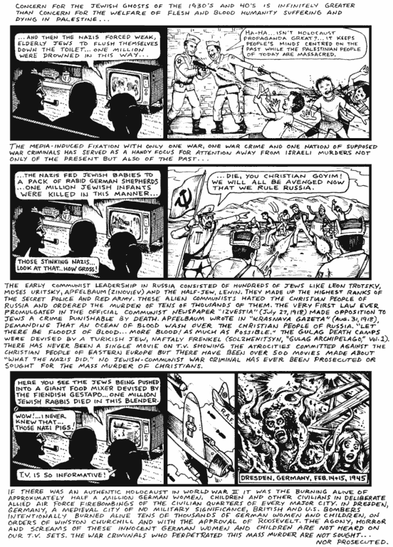 ‘Holocaust’ is no ordinary noun. Rather, it is a loaded gun leveled at the head of the West and the rest. Give them their money and their pride of place or get your head and reputation blown off. You will notice that never, ever does debate in the captive media condescend to deconstruct the Zionist Privilege embodied in and sanctified by the designer label ‘Holocaust.’ Worship the Zionists and submit to their demands - that is what the term Holocaust means. A demand for special privilege protected by a shell of pseudo-history; that is an objective description of the term. The heart of the ‘Holocaust,’ taking at face value the term’s pretension to historical designation, is the claim that six million Jews were murdered by Nazi Germany, most of them by gassing. The evidence for the gassing is never discussed. Photos of crematories and bodies stacked like cord wood are shown. No context or explanation of the reason for showing them is given. The connection is to be assumed. But never is any ordinary evidence, let alone proof, of the gassing allegation advanced. That Jews were gassed is treated as though it were already proved and therefore unquestionable, save by the depraved. Thus, the practical job of the media and the well intentioned everyman is to smear and ostracize anybody who argues against settled truth. We all know that Jews were gassed, and that those who say otherwise are deniers driven by hate.