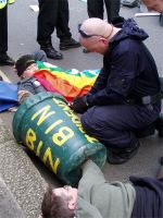 Given the above, it was inevitable that police would ensure another court appearance. Highly visible to Tony Blair, as he made his weekly visit to Parliament to face Prime Ministers Questions, she presented a fine target for 4 burly officers who arrested her for 'potential breach of the peace', changing to 'obstructing a police officer' on arrival at the nick, only to escalate once more to 'assaulting a police officer'.